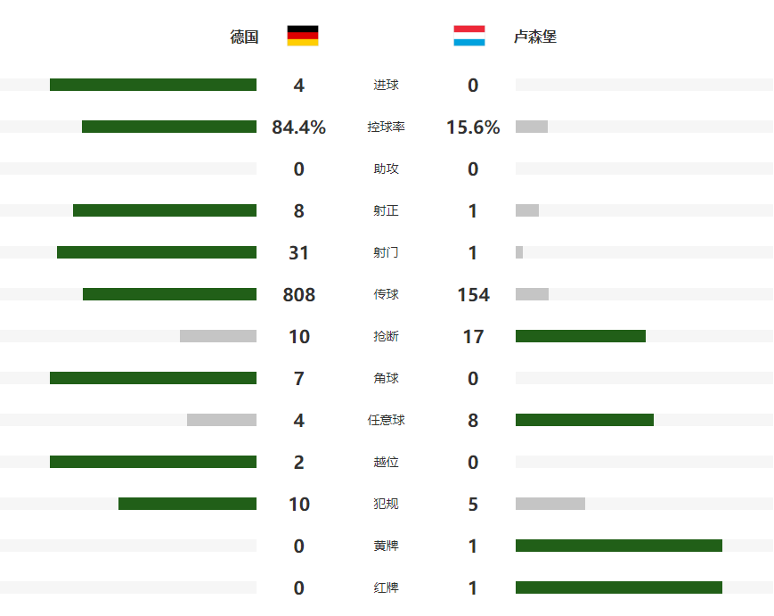 第18分钟卢森堡球员卡尔森禁区内手球,主裁判直接红牌将其罚下,还给了德国队一粒点球,基米希稳稳主罚命中,将领先的优势扩大到了2球,半场比赛结束前,日耳曼战车连续错失良机,先是劳姆禁区左侧面对空门补射踢飞,随后基米希禁区右侧的小角度攻门被门将扑出。