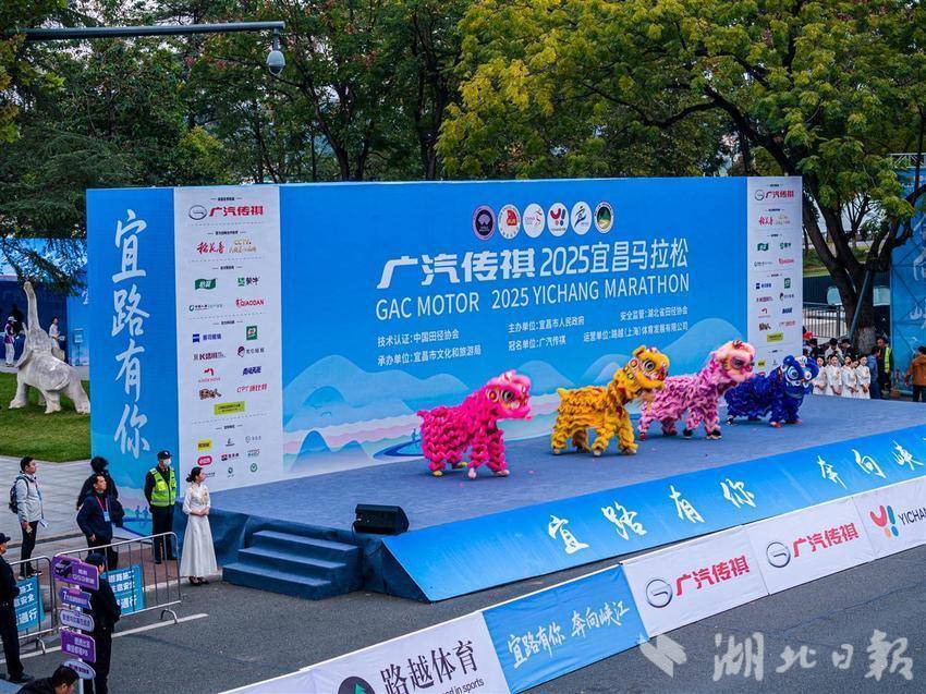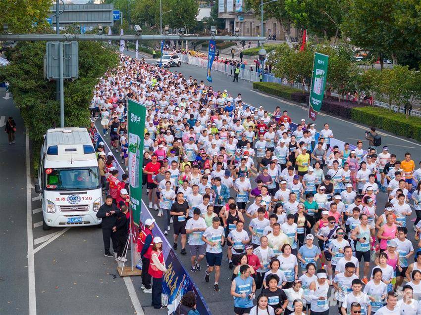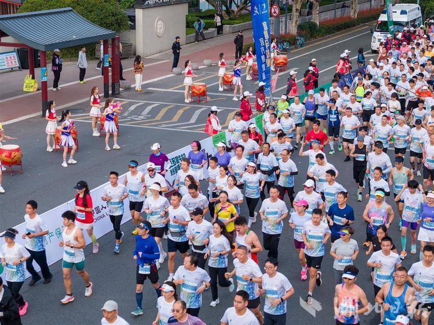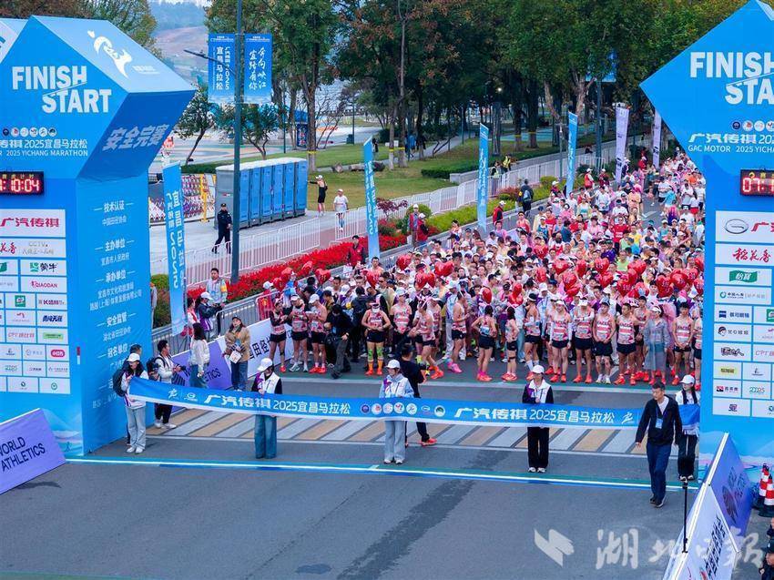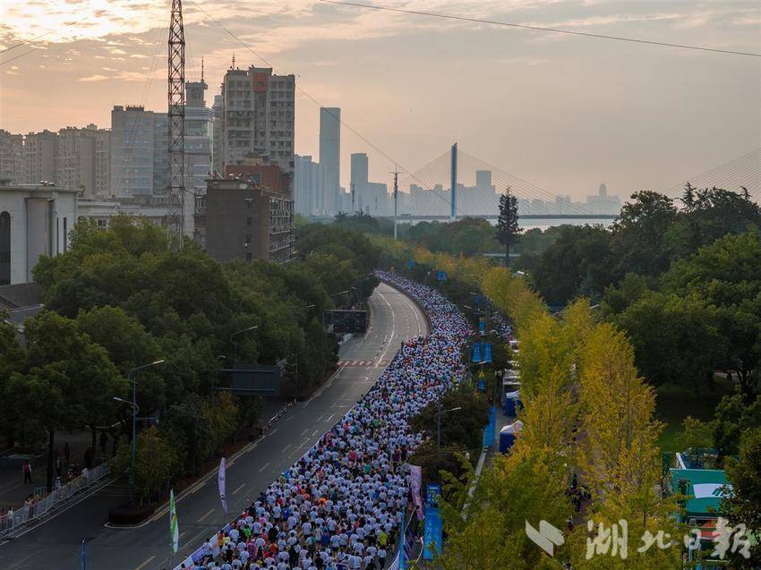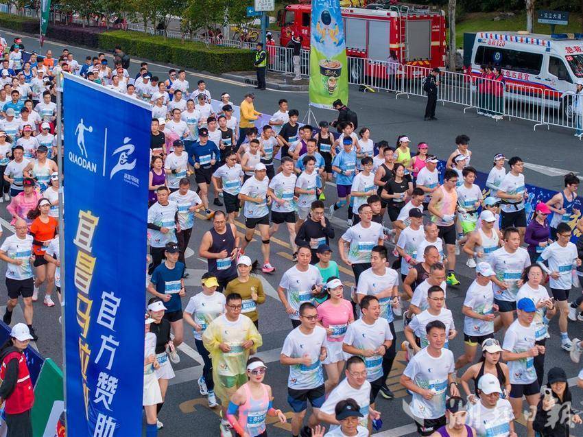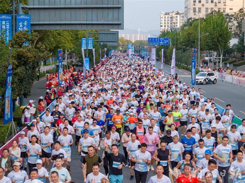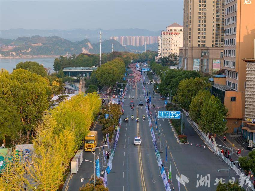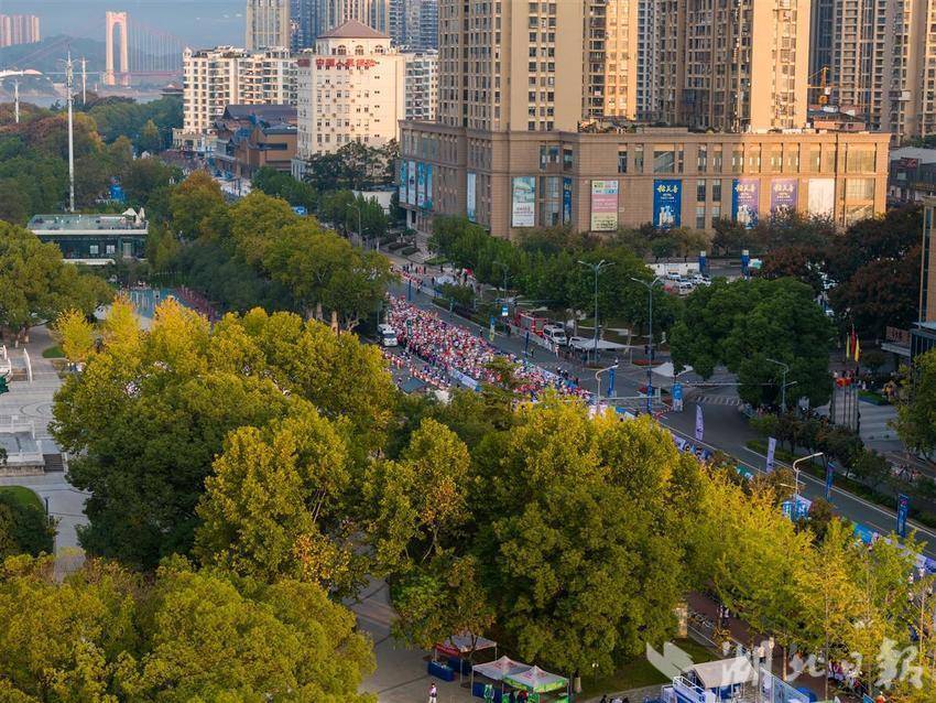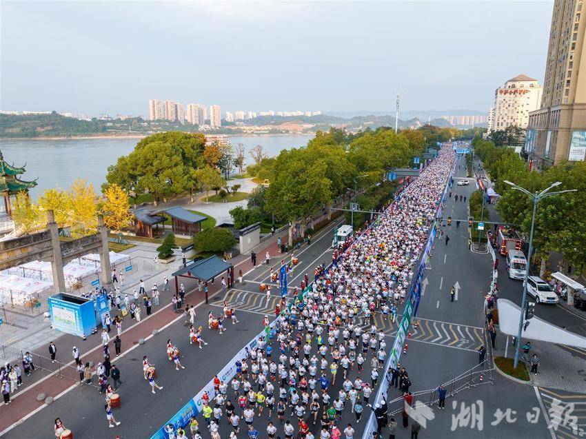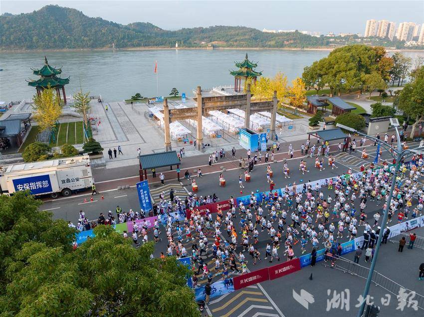 2025宜昌马拉松今早鸣枪,万余全马、半马跑者沿江开跑,滨江公园见证热血瞬间。(湖北日报全媒记者 夏晓君 摄)